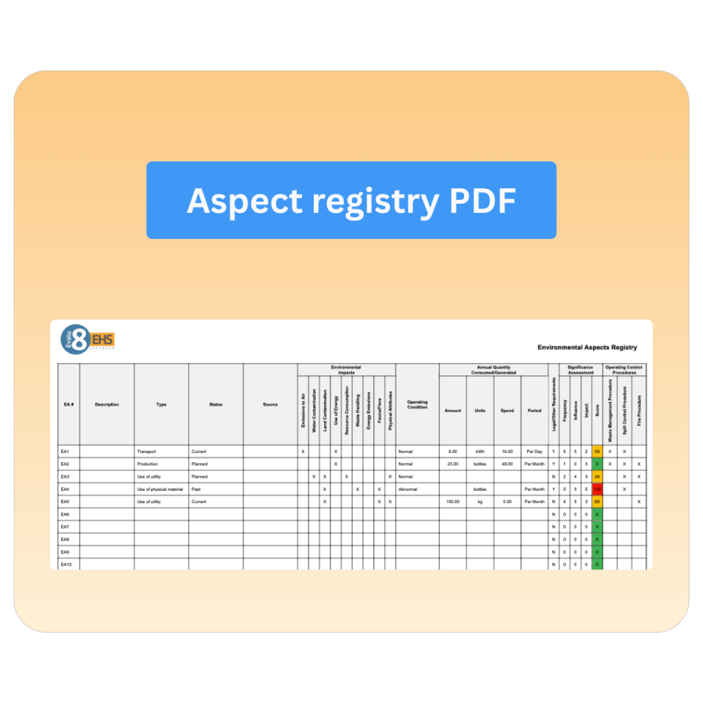 Evalu-8 EHS brings aspects and impacts management into one place so you can record environmental aspects, assess impacts, and maintain a consistent register across every site. Apply structured scoring, assign owners and operating controls, set review dates, attach evidence, and keep a complete history of updates and approvals ready for audits, inspections, and ISO 14001 reviews.