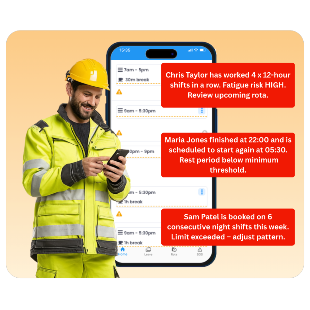 Track actual hours worked, overtime, call-outs, and changes in real time. Use guided checks to record how people feel, and trigger alerts when fatigue thresholds are reached.