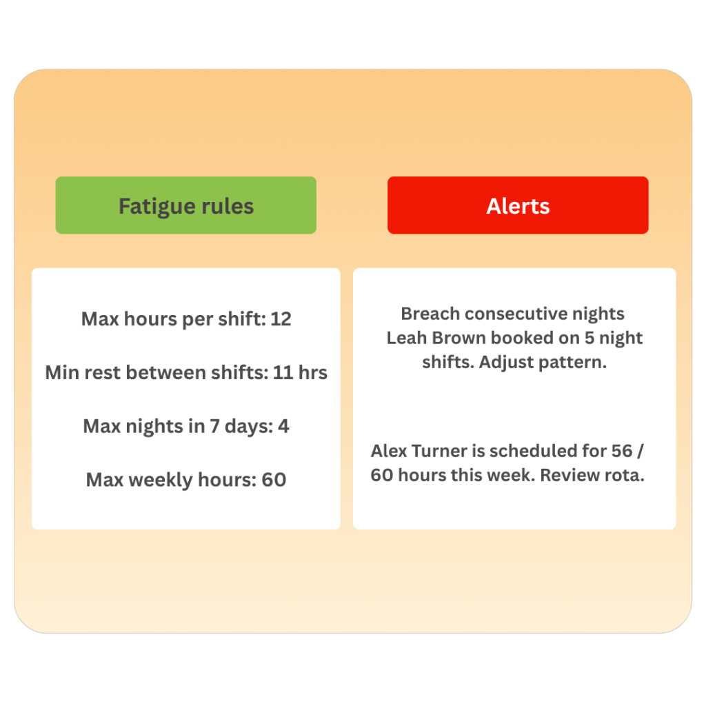Automatically detect long shifts, short rest periods, frequent nights, and back-to-back duties. Risks are flagged instantly so managers can act early and prevent unsafe working.