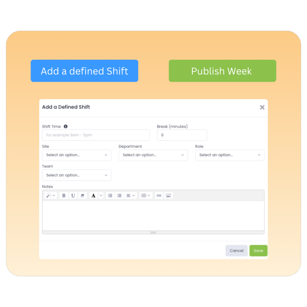 Add roles, sites, shift patterns, and team members. Capture availability, contracted hours, and any key requirements (skills, authorisations, supervisors).