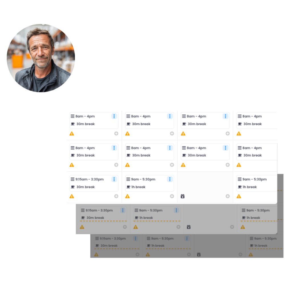 Build reliable rotas in minutes. Keep every site covered across early starts, late finishes, weekends, and callouts, with a clear view of who is on shift, where, and what still needs covering.