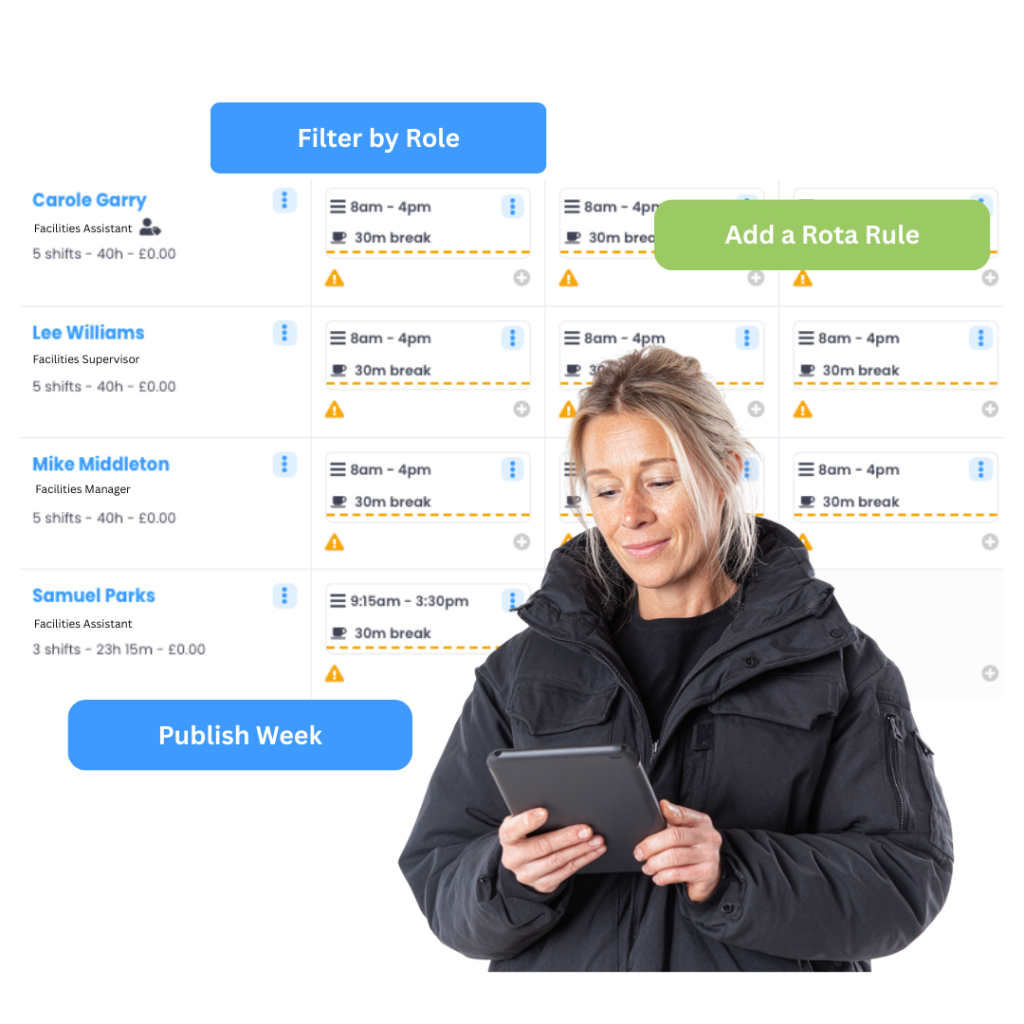 Create working patterns for each facilities team (cleaning, estates, catering, reception), including early starts, late finishes, split shifts and weekend cover. For anyone without fixed days, assign shifts individually so the rota reflects how your sites actually operate, not best guesses.