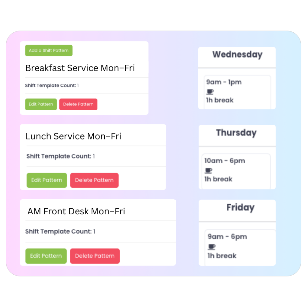 Set up base patterns for your regular team, including contracted hours and break rules. Then layer in flexible shifts for part-time, weekend, and seasonal staff so your rota reflects how your venue actually trades.