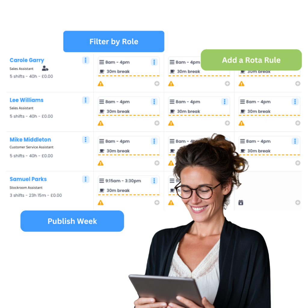 Because rotas need to adapt to coverage requirements, scheduled hours may vary slightly week to week. However, over the course of the rota cycle, scheduled hours should generally align with the employee’s contracted hours.