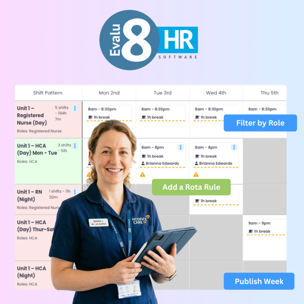 Evalu-8 HR includes rota management software for hospices designed to help managers plan staffing across multiple services while keeping coverage requirements visible.