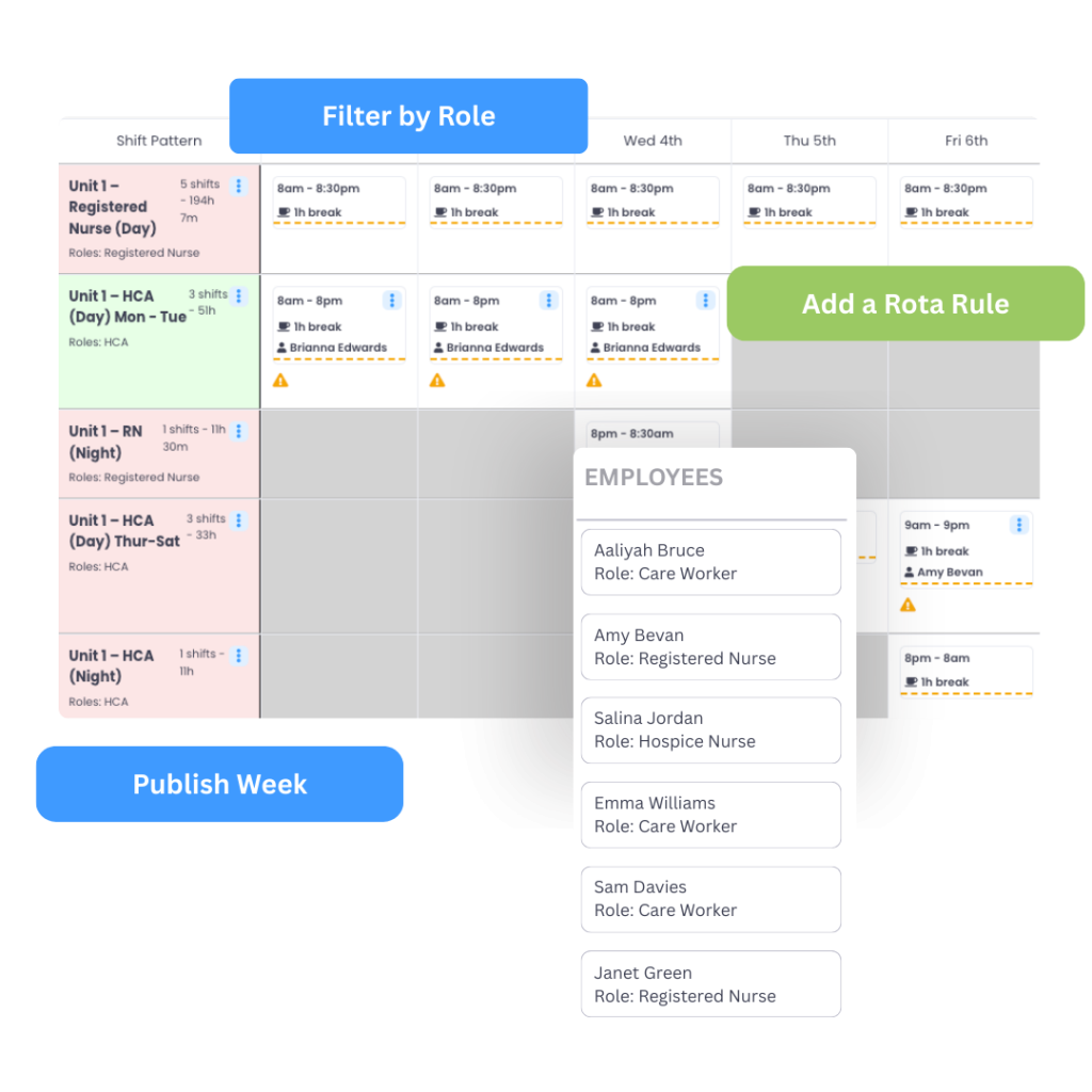 Rota management software helps hospice managers plan these longer rota cycles while maintaining visibility of leave, contracted hours and coverage levels before schedules are published.